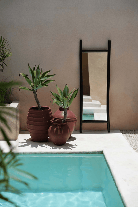 - Cenários neutros: Realce os materiais naturais colocando os espelhos contra paredes brancas ou em tons de terra.